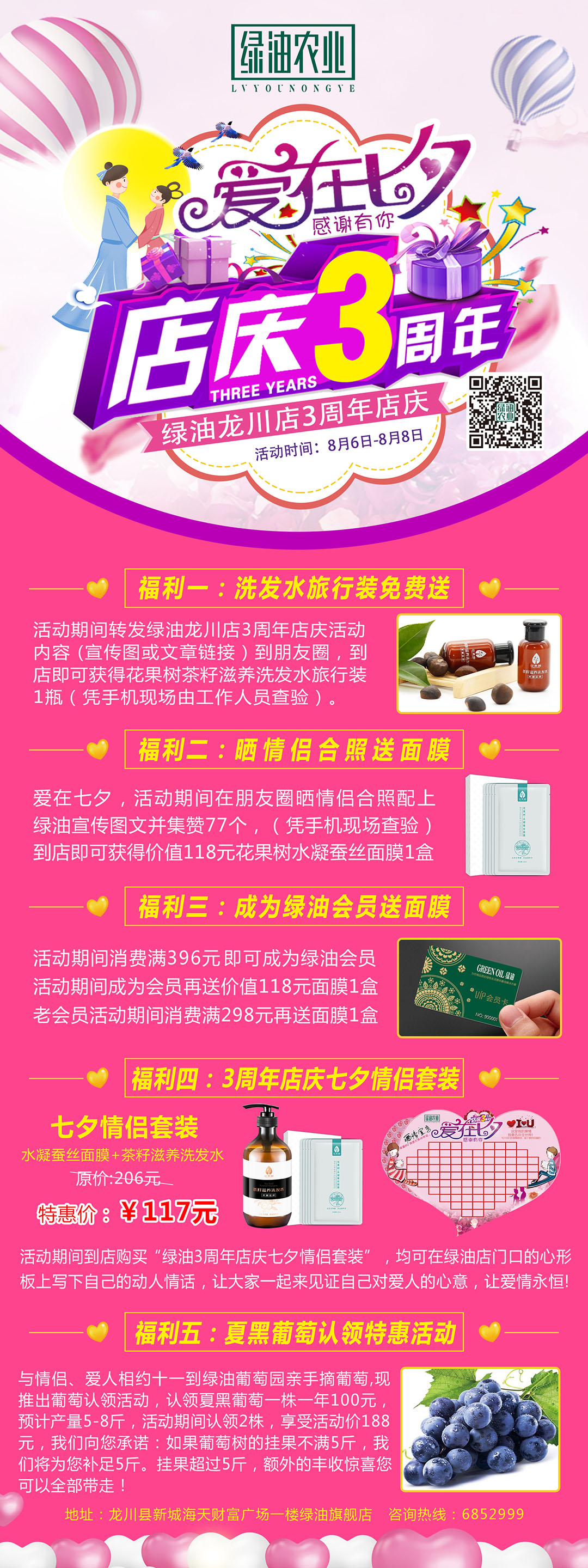 愛在七夕,感謝有你,綠油龍川店3周年店慶,轉(zhuǎn)發(fā)朋友圈到店送洗發(fā)水旅行裝1瓶,集贊77個到店送價值118元蠶絲面膜1盒。