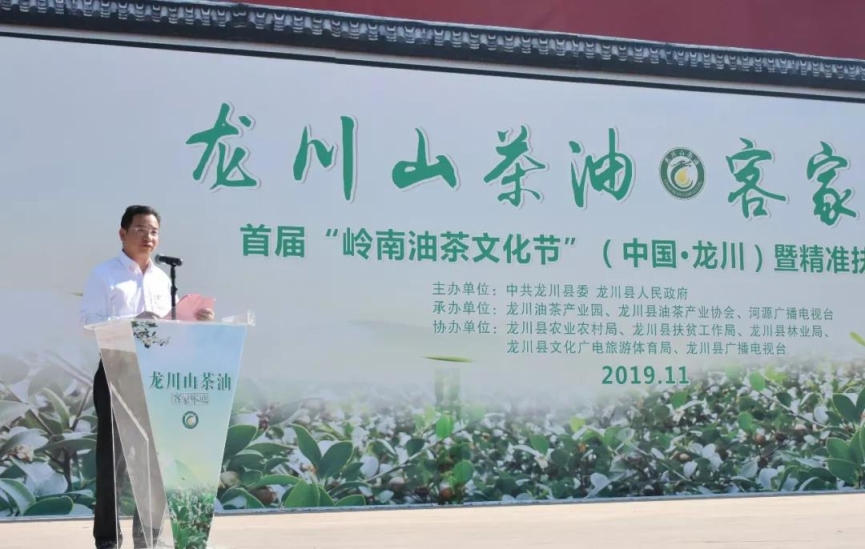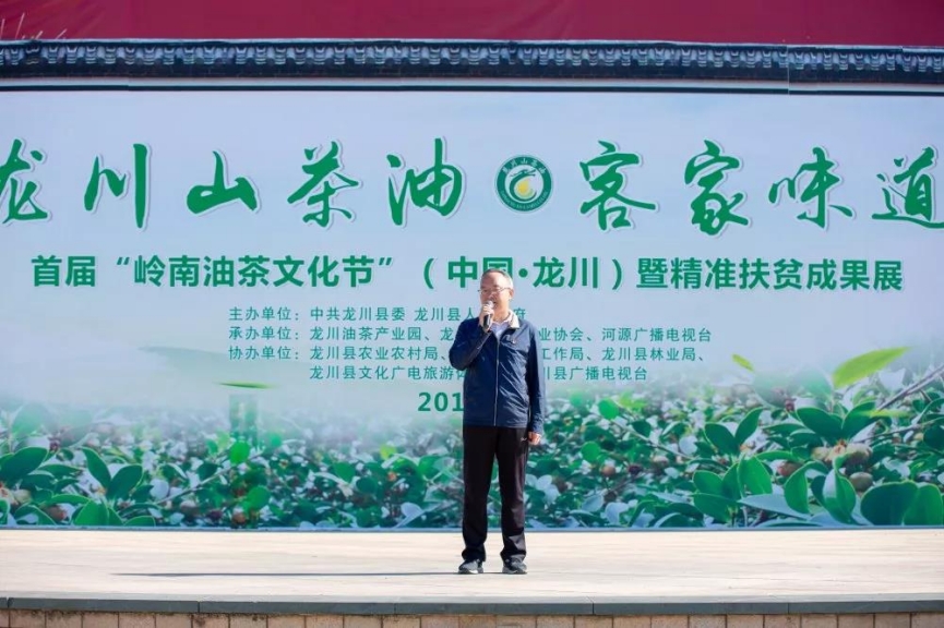 ▲縣委書記黃添勝宣布龍川首屆“嶺南油茶文化節(jié)”暨精準(zhǔn)扶貧成果展正式開幕。
