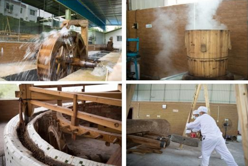 據(jù)駱東梅介紹說,每年霜降前5天,是龍川地區(qū)集中采摘油茶果的最佳時期。經(jīng)過人工采摘、剝殼、晾曬、挑選后,油亮的茶籽被放入油碾中,通過水車推動油碾旋轉(zhuǎn),一顆顆茶籽在石槽內(nèi)被反復(fù)碾壓成棕黑色的粉末;碾壓好的茶籽粉再進行高溫蒸煮,然后趁熱放入壓餅機做成茶油餅,再放入木楔中。伴隨著油錘撞擊壓榨機擠壓油餅,一滴滴茶油被榨了出來。