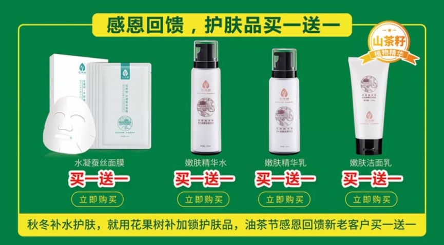 秋冬補(bǔ)水護(hù)膚,就用花果樹補(bǔ)加鎖護(hù)膚品,為感恩回饋新老客戶,在油茶節(jié)活動(dòng)期間購買以下護(hù)膚品享受買一送一優(yōu)惠。