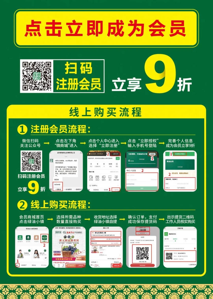 ②線上綠油微商城油茶節(jié)預(yù)定專區(qū)付款預(yù)定,新會員可先在微商城在線注冊成為綠油會員,即可預(yù)定買一送一,提貨可憑付款訂單選擇線下自提或快遞到家。