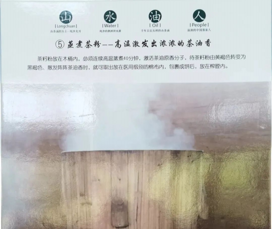 5.蒸煮茶粉。茶籽粉放在木桶內(nèi),連續(xù)高溫蒸煮40分鐘,激活茶油原香分子,待茶籽粉由黃褐色轉(zhuǎn)變?yōu)楹诤稚?、散發(fā)陣陣茶油香時(shí),就可取出放在醫(yī)用級(jí)別的棉布內(nèi),包裹成餅后,放在榨膛內(nèi)。