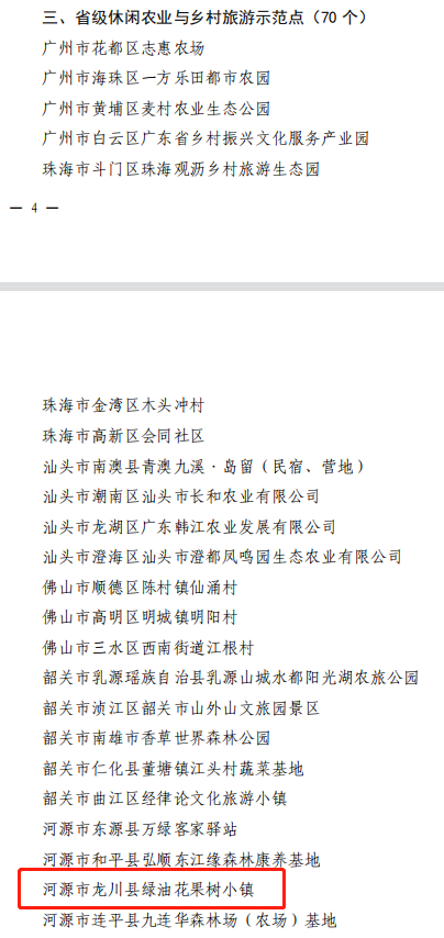 近日,省農業(yè)農村廳、省文化和旅游廳公布2022年度省級休閑農業(yè)與鄉(xiāng)村旅游示范單位名單。其中,河源市龍川縣入選省級休閑農業(yè)與鄉(xiāng)村旅游重點縣,綠油花果樹小鎮(zhèn)入選省級休閑農業(yè)與鄉(xiāng)村旅游示范點。