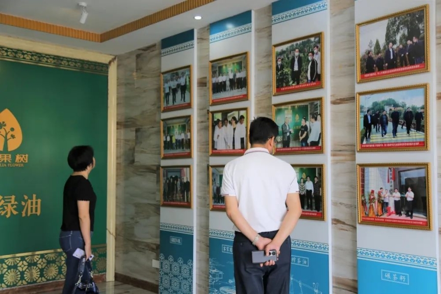 調(diào)研組一行來到綠油公司總部,在綠油農(nóng)業(yè)董事長駱東梅和綠油農(nóng)業(yè)總經(jīng)理胡偉豪的陪同下,先后參觀了綠油古法榨油坊、綠油農(nóng)業(yè)發(fā)展榮譽墻、綠油產(chǎn)品展廳、綠油鮮果處理中心。