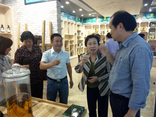 (領(lǐng)導(dǎo)一行在龍川旗艦店品嘗有機(jī)山茶油)