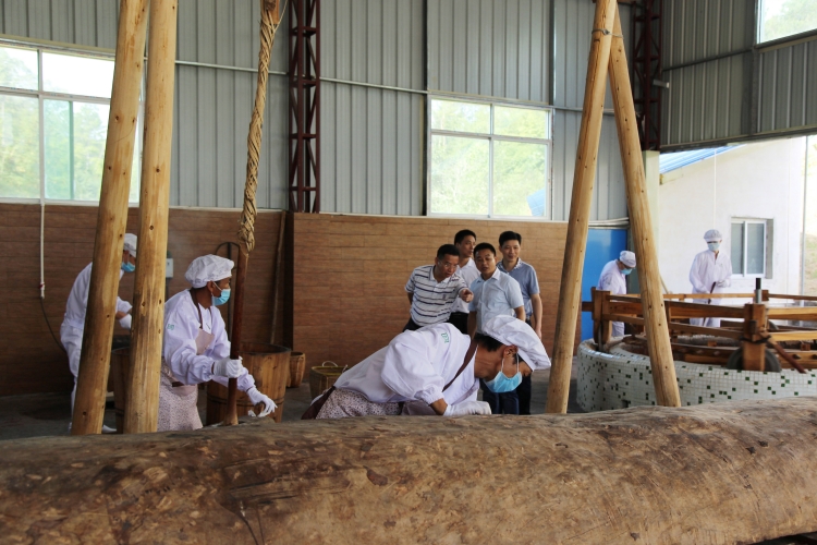 (駱東梅董事長向領(lǐng)導(dǎo)一行介紹千年古法壓榨生產(chǎn)線)