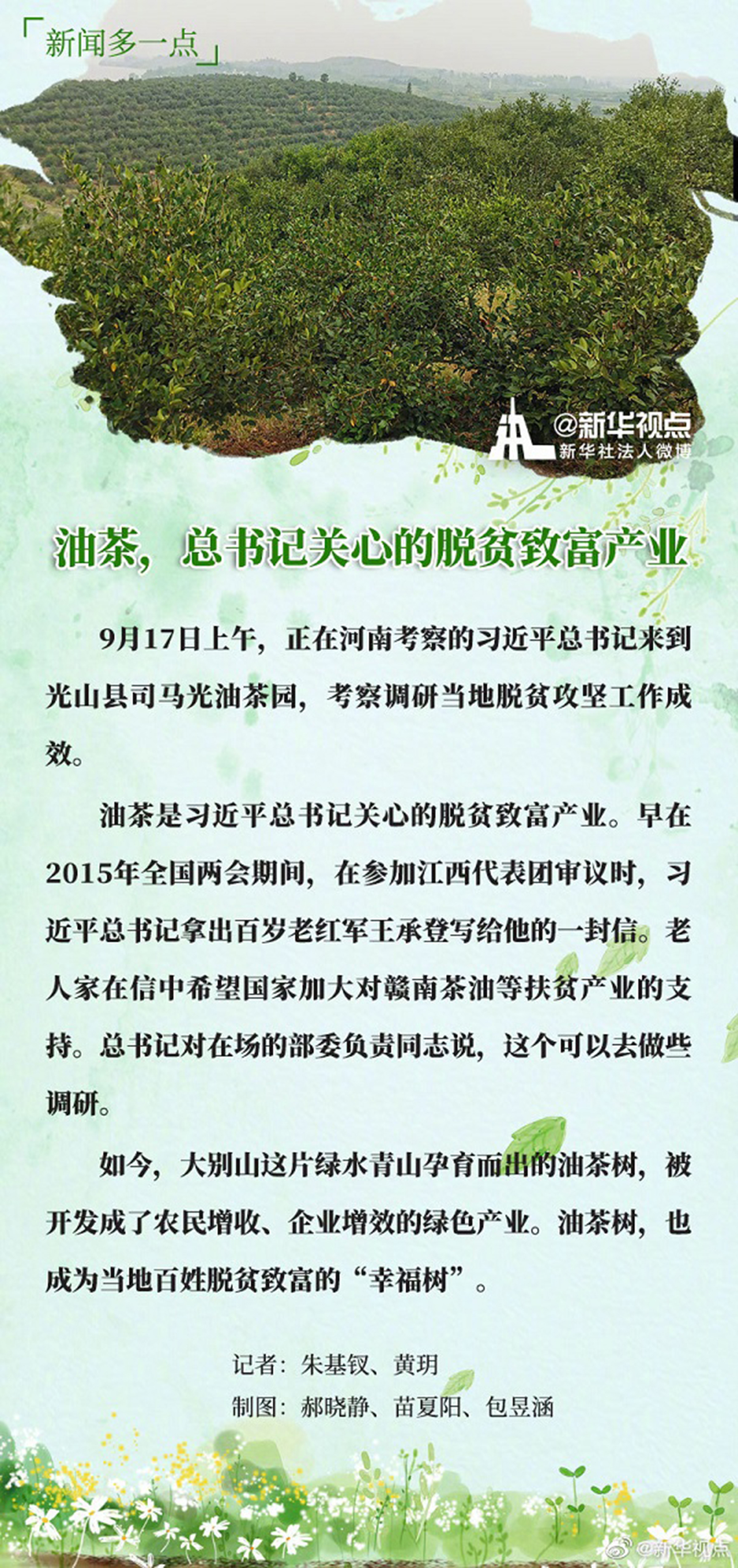 17日上午,正在河南考察調(diào)研的習近平總書記來到光山縣司馬光油茶園,察看當?shù)禺a(chǎn)業(yè)脫貧工作成效。習近平冒著小雨走進萬畝油茶園,同正在勞作的村民們親切交流,細致詢問怎么出工、工資多少、生活怎樣。村民回答說現(xiàn)在脫貧了,生活天天像過年,習近平連聲說好。習近平強調(diào),種油茶綠色環(huán)保,一畝百斤油,這是促進經(jīng)濟發(fā)展、農(nóng)民增收、生態(tài)良好的一條好路子。路子找到了,就要大膽去做。要通過“公司加農(nóng)戶”的方式,朝著市場化、規(guī)?;姆较虬l(fā)展,使公司和農(nóng)民彼此受益。
