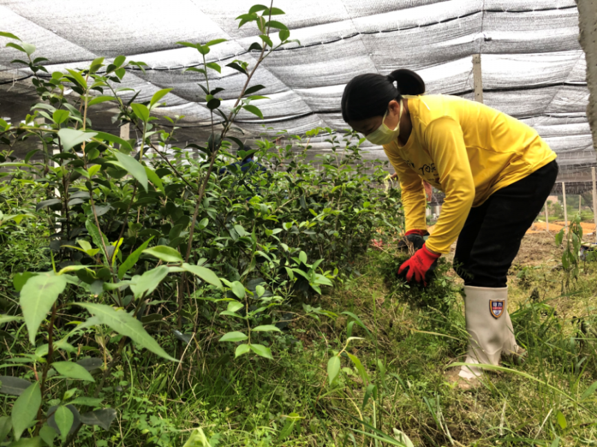 貧困戶楊滿風(fēng)在龍川綠油農(nóng)業(yè)種植養(yǎng)殖休閑養(yǎng)生田園綜合體負(fù)責(zé)除草等工作。(攝影:曾俊霖)