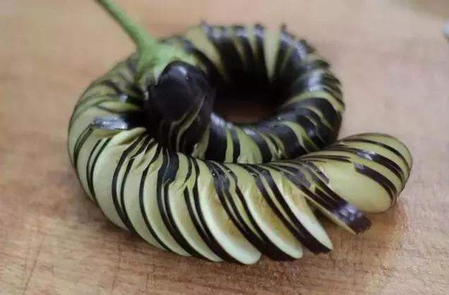 切盤龍茄子和切蓑衣黃瓜一樣的手法,選擇比較直的長(zhǎng)茄子更好切。先豎著切片,不切斷,也就是刀和茄子成90度。