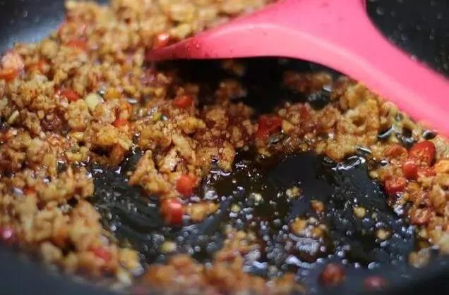 鍋里加入適量綠油老樹茶油,爆香姜蒜末、小米辣,下入豆瓣醬炒出紅油,下入肉末翻炒,加入少許生抽、蠔油,翻炒均勻。