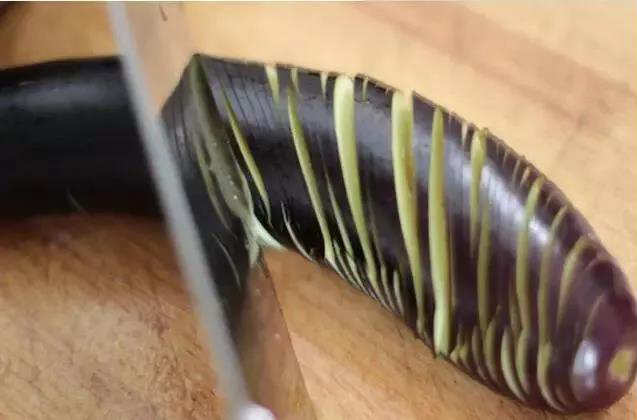 然后將茄子掉頭,斜著切不切斷,刀和茄子成45度。切完后可以將茄子拉長(zhǎng)。